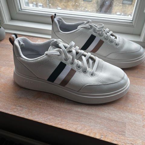 Hugo Boss sneakers i str. 42. Modellen er lave sneakers i hvid farve med snørelukning og kraftig, hvid gummisål. Overdelen fremstår i læder med diskrete logo-detaljer og røde stropper ved hælen. Velegnet som hverdagssko. Brugt men i fin stand.
