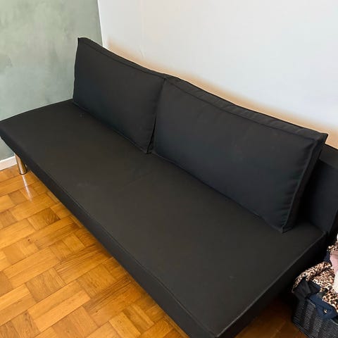 Mangler to knapper, nye kan let syes på, og man kan evt bruge dem fra bagsiden af rygpuderne hvis man gerne vil have de samme. Nogle af fjedrene giver et bulet udtryk, men de er ikke hårde at sidde på. Kan let foldes ud til 140 seng. Kan let løftes i to dele. Vejer ikke merger og jeg kan hjælpe med at bære ned fra 2. Sal. Betrækket kan tages af og vaskes. Sælges billigt grundet knapper og fjedre der buler lidt. Koster 6300,- fra ny