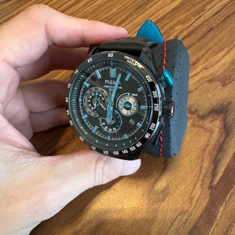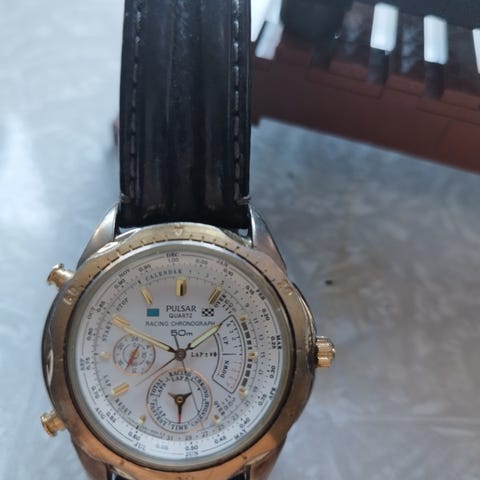 Pulsar chronograph lavet for M-sport Ford world rally team. Limited Edition nr 90/1000. Solar batteri med gang reserve indikator. Original rem. Fuldt sæt. Kommer fra røgfrit hjem. Billigt alternativ til tag heuer Gulf edition. 43 mm plus krone