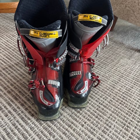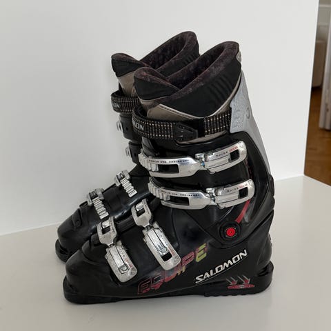 Salomon Evolution skistøvler i størrelse 28,5 (ca. str. 43–44). Modellen har hårdt plastskal med flere justerbare spænder foran og bagpå. Farven er primært sort med røde spænder og grå detaljer øverst på skaftet. Inderstøvlen er polstret for støtte og komfort. Velegnet til alpint skiløb og brug med standard alpine ski-bindinger.
