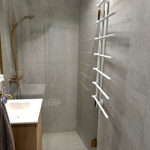 Glasdør til brusekabine af mærket GEO som er et Tysk kvalitets mærke, i let farvet glas med hængslet folde dør og aluminiumsprofil. Designet til montering i bruseområde med pladsbesparende funktion, måske i stedet for et forhæng. Velegnet til badeværelser med behov for enkel adgang og vandafskærmning. Meget enkel opsætning med en alu-profil i væggen hvori glasdøren skrues og justeres i skinnen.