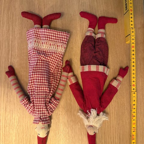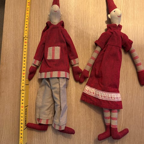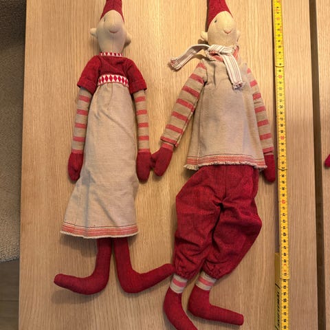 Maileg nissedukker i stof. Sættet består af to bløde stofdukker udformet som nisser med rødt tøj, stribede ærmer og lange nissehuer. Dukkerne har bløde kroppe, der egner sig til leg eller som julepynt på børneværelset eller i stuen. Velegnet som legetøj til børn eller som dekorative figurer i juletiden.