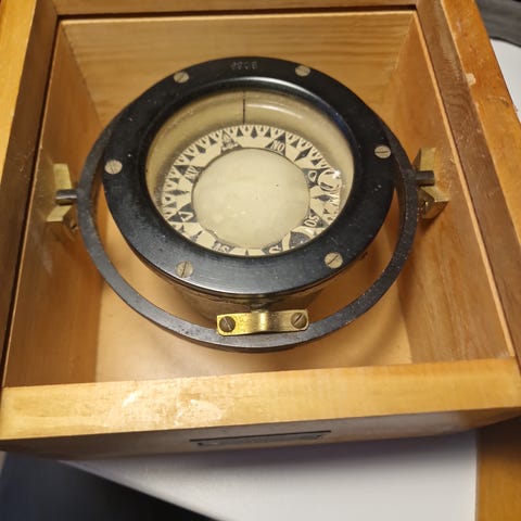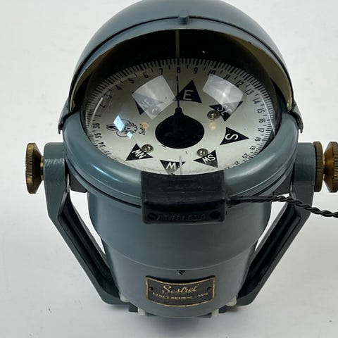 Sestrel "Dead Beat" kompas fra England, år 1910. Udført i mørkt træ med flotte detaljer i messing – et fremragende originalt eksemplar. Dette kompas er en elegant maritim prydgenstand, der vil tilføre karakter og historie til enhver stue, kontor eller samling. Et unikt stykke for den kvalitetsbevidste samler eller for dig, der elsker autentiske maritime effekter. Mål: Højde ca. 120 cm.