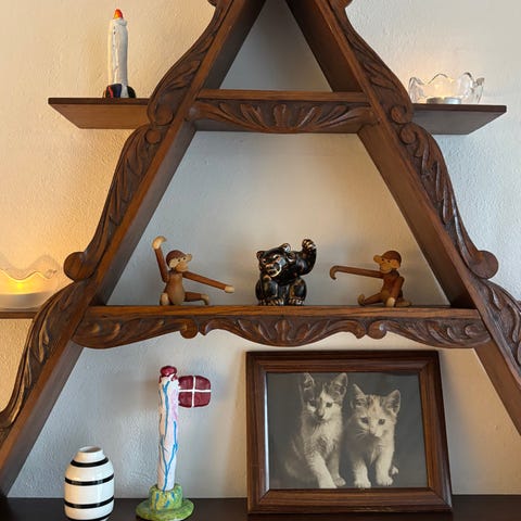 Amagerhylde i egetræ med tre niveauer. Hylden er udført i egetræ med dekorativt udskårne kanter langs siderne. Hylden er formentlig fra 1930'erne. Egnet til opbevaring eller udstilling af mindre genstande som pynt, planter eller nips på væg. Målene er 70 cm bred og 60 cm høj og 11 cm dyb.