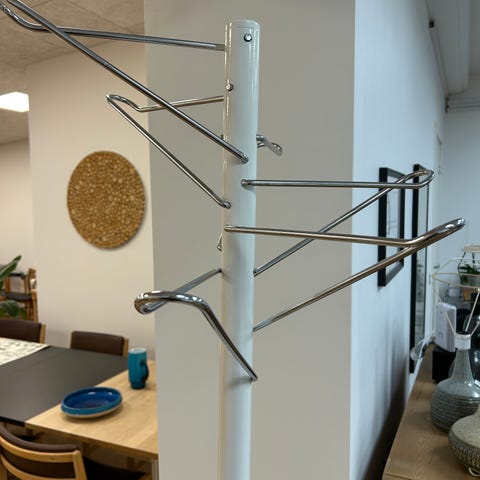 Minimalistisk og elegant stumtjener udført i sortlakeret stål med flotte messingdetaljer. Har et stilrent, industrielt udtryk der passer perfekt ind i moderne boligindretning, entré eller garderobe.