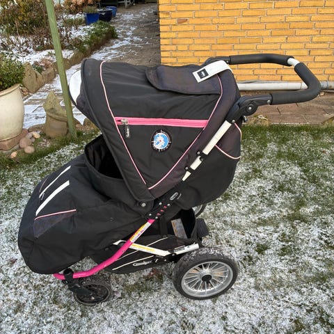Læder styr, varekurv, indbygget regnslag og myggenet, original dækken, fluenet og regnslag der dækker hele vognen medfølger. Kan ligges ned så barnet kan sove i vogne. Køre rigtig godt og nem at klappe sammen drejehjul foran kan låses