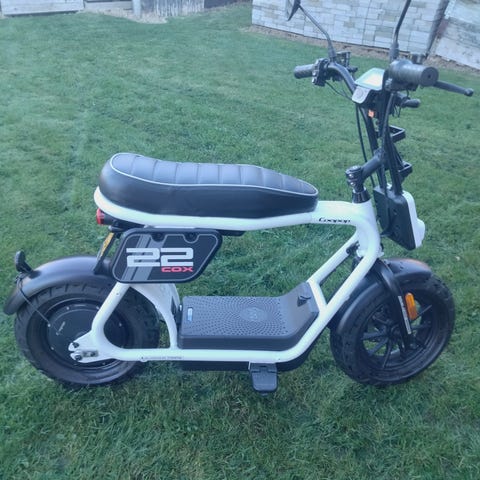 el-knallert i hvid med sort sæde. Modellen har digitalt display i styret med visning af hastighed, batteriniveau og kilometerstand. Foran er der integreret LED-forlygte, og bagpå LED-baglys samt nummerpladeholder. El-knallerten er udstyret med brede dæk og lav indstigningsramme, som gør den egnet til kortere ture i by- og nærmiljø. 2900km - nr plade m følger ved omregistrering når du henter