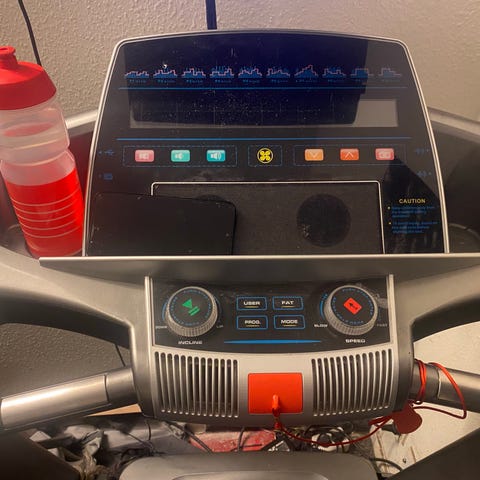 Kilberry TT5100 løbebånd med elektronisk display og betjeningspanel i front. Løbebåndet har flere knapper til justering af hastighed og programmer samt visning af tid, distance og andre træningsdata. Der er holder til drikkedunk og sikkerhedsnøgle på konsollen. Egnet til indendørs løbe- og gangtræning i hjemmet.