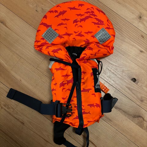Child’s Lifejacket redningsvest til børn 0-20 kg. Farve gul/orange med mønster og blå justerbare remme. Vest med stor krave for ekstra opdrift omkring hovedet samt reflekser på skuldrene. Lynlåslukning foran kombineret med taljerem og skridtsnor for bedre pasform. Velegnet til brug ved sejlads og ophold ved vand for børn inden for vægtintervallet 0-20 kg.