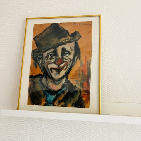 Maleri med klovn motiv i et flot grafisk udtryk. Billedet viser en klovn i hvide og farvede flader med tydelige konturlinjer og cirkelformede detaljer. Farvepaletten er varme farver domineret af hvid, rød, gul, blå, grøn og mørke nuancer i baggrunden. Velegnet som vægdekoration i stue, børneværelse eller andre rum, hvor et farverigt og fint motiv ønskes.