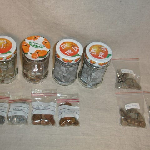 To gamle metaldåser fyldt med 2 øre
