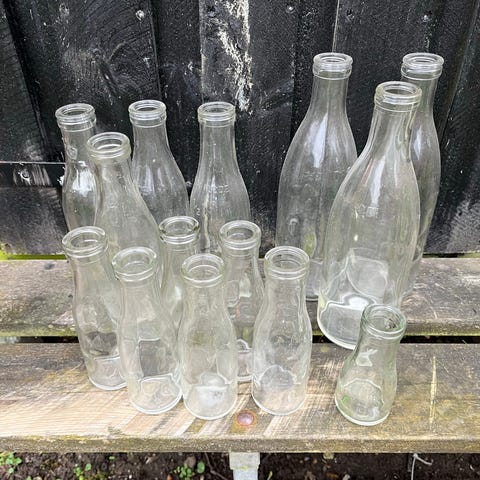 To klare glasflasker i forskellig højde med metal låg. Egnet til opbevaring af fx mælk, saft eller andre kolde drikke i køkkenet. Kan også bruges dekorativt til borddækning eller som små opbevaringsflasker.