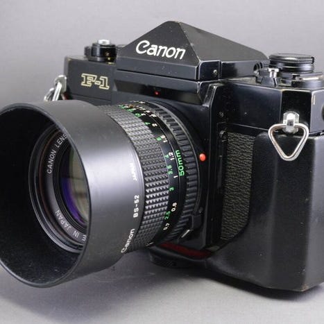 Canon kamera. Kameraet fremstår som et ældre, analogt model med udskifteligt objektiv. Objektivet har manuel fokus og blændeindstilling med afstands- og blændeskala markeret på huset. Velegnet til analog fotografering for brugere, der ønsker et manuelt kamera med klassisk betjening.