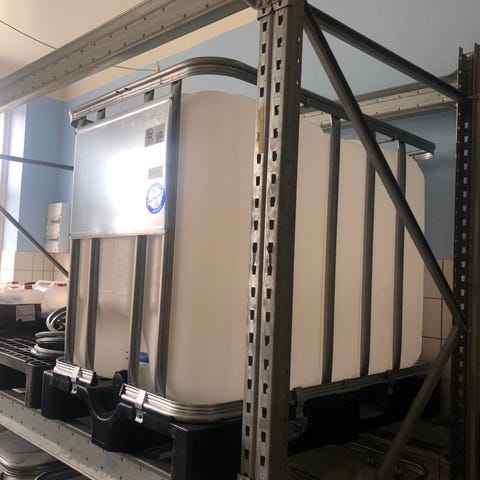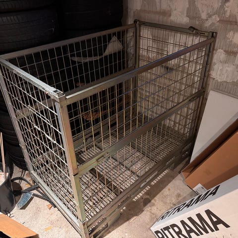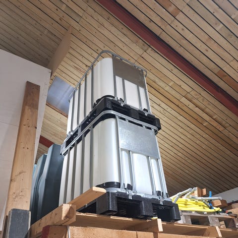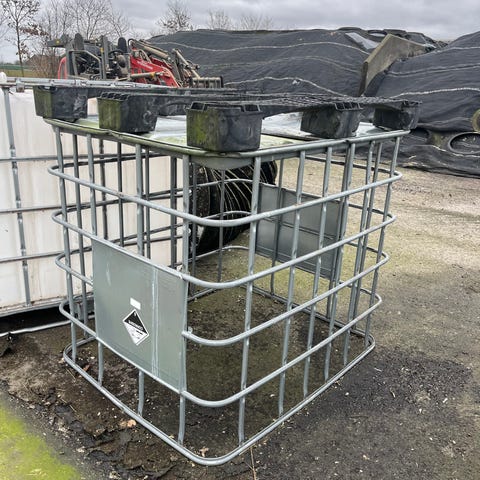 IBC pallettank i plast med hvid beholder og ydre stålgitter. Beholderen står på pallefundament og er udstyret med påfyldningsstuds i toppen samt aftapningshane i bunden. Egnet til opbevaring og håndtering af væsker, f.eks. vand eller andre kompatible væsker, hvor en større beholder med tappefunktion er praktisk. Stålgitteret giver ekstra stabilitet under transport og opbevaring. Rengjorde og klar til brug