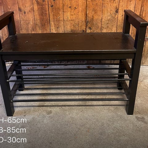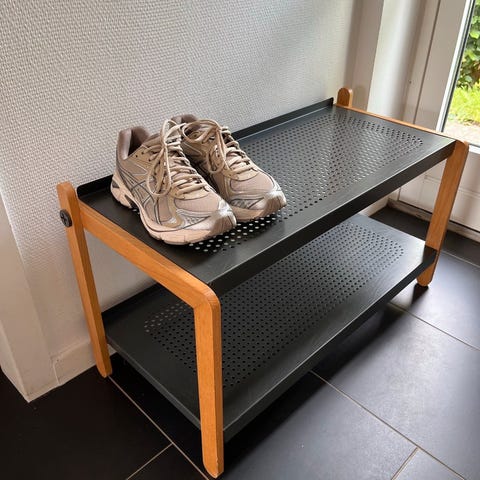 Lækker sko reol i metal og asketræ. Pæn stand - dog med alm brugsspor. Sælges grundet flytning.