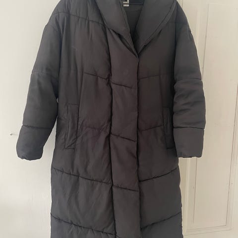 Noisy May frakke til kvinder i sort i størrelse M. Modellen er en lang, vatteret frakke med hætte og gennemgående lukning foran. Frakken har et enkelt, quiltet design og er egnet som yderjakke i køligere vejr. Materialet er polyester, som gør frakken let at vedligeholde og anvendelig til daglig brug.