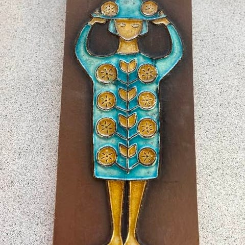Keramisk relief af lilla/gul fisk. 28 x 19,5 cm. Kan leveres på Sjælland.