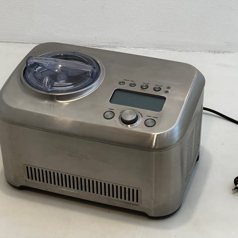 Betjeningspanelet omfatter display, programknapper og drejeknap til indstillinger. Låget er gennemsigtigt, så indholdet kan ses under tilberedning. Egnet til fremstilling af is og frosne desserter i hjemmet.