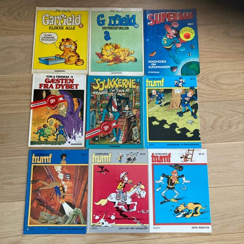 Blandet lot med tegneserieblade og tegneseriealbums. Lotten omfatter blandt andet flere Tom & Jerry-blade samt albums med Garfield, Steen & Stoffer og Scooby-Doo. Der er både hæfter og større albums i farver. Egnet til samlere af klassiske tegneserier eller som læsestof til børn og voksne, der kan lide humoristiske og eventyrlige historier i tegneserieformat.