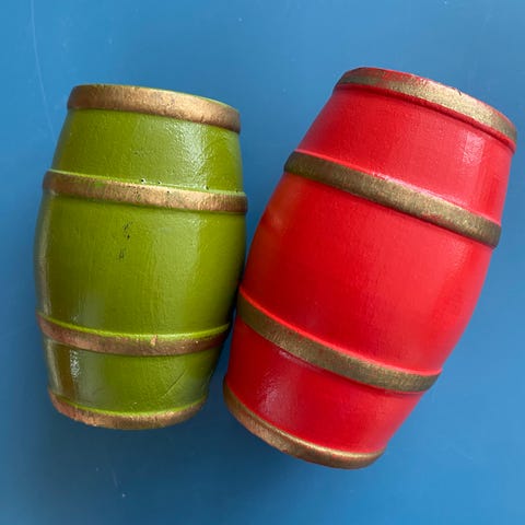 Fine vintage træ fastelavnstønder fra 1960’erne og en meget gammel + 2 katte.