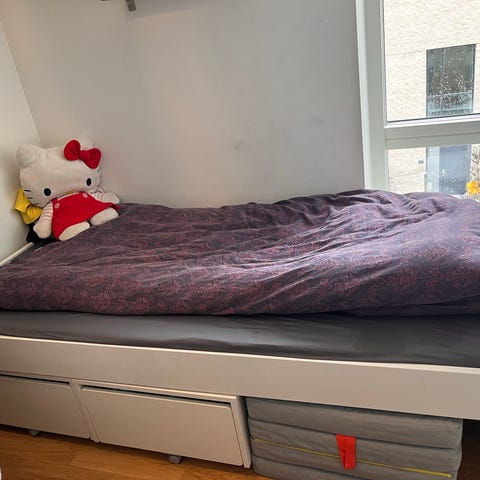 IKEA seng med opbevaring i hvid. Sengen har integrerede skuffer under liggefladen, som giver ekstra opbevaringsplads til f.eks. sengetøj eller tøj. Velegnet til soveværelse eller gæsteværelse, hvor der er behov for både seng og opbevaringsmuligheder i ét møbel.