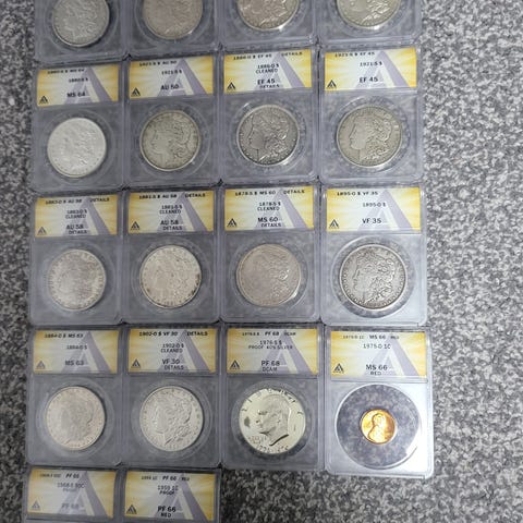 34 stks blandede danske 1 ounces 999% sølvmønter til salg. Alle kommer I kapsler og med certifikat som på billedet. Sælges kun samlet som 34 ounces, hvilket er lidt over 1kg rent sølv (1057.3 gram). Salget er kun midlertidigt, og annoncen slettes igen søndag hvis ikke solgt. Nu er muligheden her for at accumulere en masse spændende mønter på 1 gang, til fornuftig pris inden sølvpriserne stabiliseres tilbage til tidligere højder. Hvis du ikke allerede ejer sølv, er dette en god starter pack for sølvstackeren.