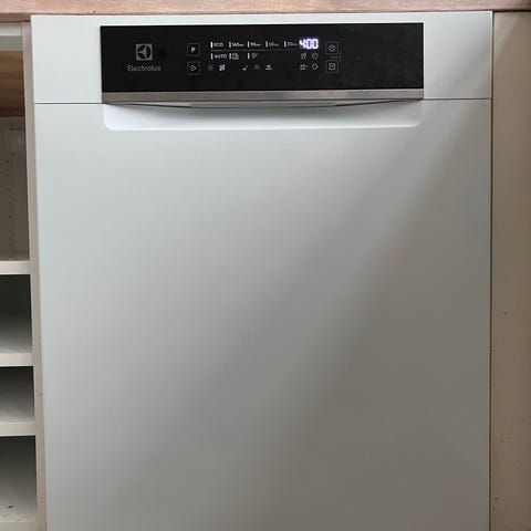 Electrolux integreret opvaskemaskine i hvid. Modellen er beregnet til fuld integration i køkken, hvor der normalt monteres en køkkenfront på lågen. Betjeningspanelet er placeret øverst på fronten med display og programknapper. Maskinen tilsluttes vand, afløb og strøm som en standard integreret opvaskemaskine og er egnet til indbygning under bordplade i et køkkenelement. Velegnet til almindelig daglig opvask i husholdningen.