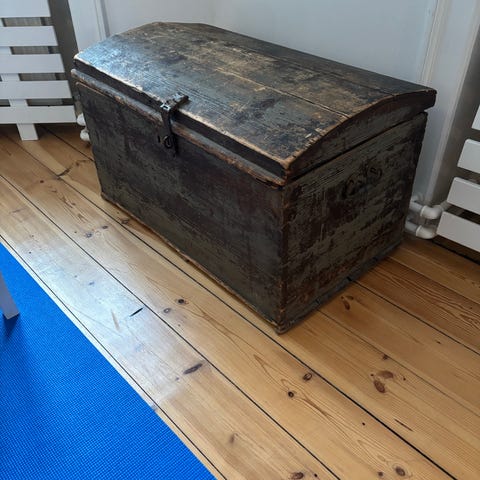 Malet træskrin/blå kiste i træ med buet låg. Kisten er dekoreret med håndmalede røde roser og grønne blade på front og låg. På låget er årstallet 1958 indridset inden for en rosenkrans. Velegnet som opbevaringskiste eller som dekorativt møbel i boligindretning.