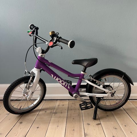 Woom 2 børnecykel med 14" hjul. Cyklen har rød ramme med hvide detaljer og lige styr med håndbremser. Sadel og håndtag er sorte. Modellen er egnet til mindre børn, typisk som første eller tidlig cykel efter løbecykel. Velegnet til kørsel på vej og cykelsti med dens brede dæk og lave indstigning, som giver barnet god stabilitet og kontrol.