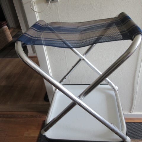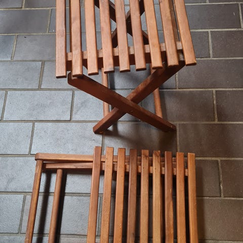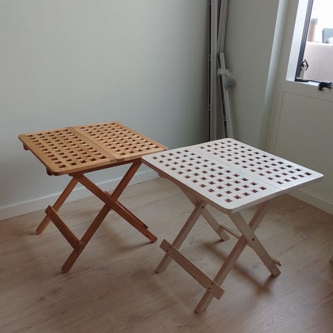 2 hvide ris klap borde med lidt brugs spor ved ben.