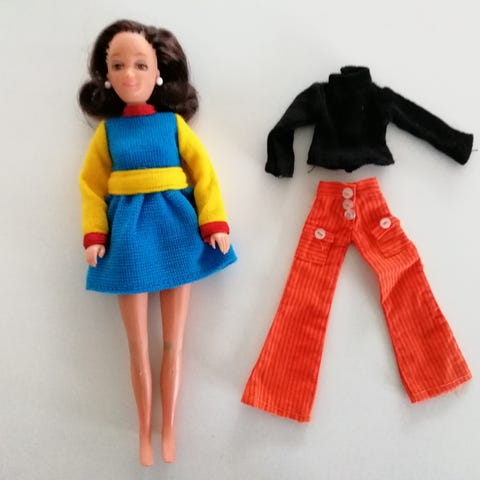 Disco Girls Dukke 21 cm. Dukken har isatte øjenvipper. Et par tomme hårhuller på højre side af hovedet. Ben har bøj men blågrønne pletter. Rosa kjole mangler hvidt bindebånd.