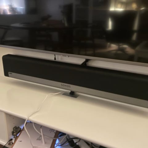 Sonos Playbar soundbar i hvid. Soundbaren er designet til brug sammen med tv og kan også indgå i et trådløst multiroom-setup via Sonos-systemet. Enheden har tilslutninger på bagsiden, herunder optisk indgang og netværksport. Velegnet til placering på møbel eller vægmontering afhængigt af beslag og opsætning. Farven er hvid med diskrete touch-knapper på toppen til grundlæggende betjening.