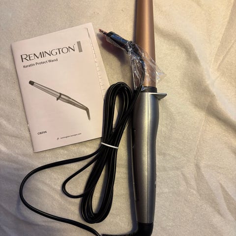 Remington krøllejern med keramisk belægning. Krøllejernet har ledning og betjeningsknapper på håndtaget. Det er velegnet til styling af håret og kan bruges til at lave bølger og krøller. Leveres med brugsanvisning som vist på billedet.