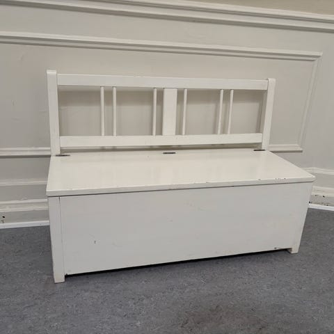 IKEA bænk med opbevaring i træ til børn. Bænken er udført i lyst træ med ryglæn og integreret opbevaringsrum under sædet. Låget kan løftes op, så der er plads til opbevaring af legetøj, bøger eller andre børneting. Møblet er velegnet til børneværelse, entre eller andre rum, hvor der er