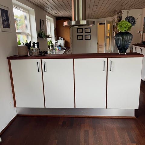 Køkkenø på hjul lavet af ikea køkkenskab og bordplade sat på hjul. Brugt, men i fin stand. Brugsspor på bordpladen kan nok fjernes med lidt slibning og olie.