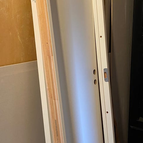 Celledør indvendig dør i hvid. Døren har målene 72,5 x 194 cm ifølge mærkningen. Glat dørblad med to forborede huller til dørgreb og låsekasse. Inkl. låsekasse og nøgle, uden greb. Uden karm.