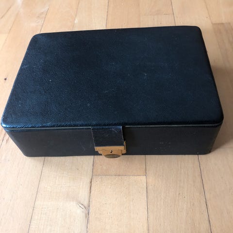 Ældre smykkeskrin med spejl og glas i den lille dør. Skummer til ringe og andet.