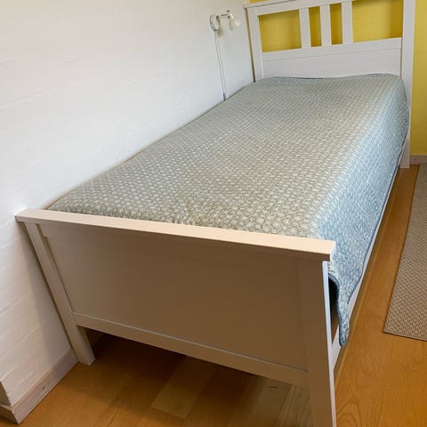 Jeg sælger en stor hvid seng med 3 enkelt madrasser på 90x200 cm fordi jeg skal flytte ud af min bolig senest 7. april 2026. Så du må gerne hente den fra 5-6. April.