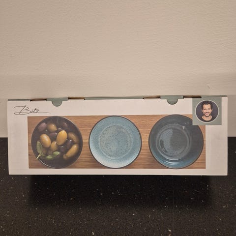 Cabaretsæt fra Bitz som er perfekt til servering af små snacks eller delikatesser. Sættet består af en serveringsbakke samt 3 skåle fremstillet i stentøj.
