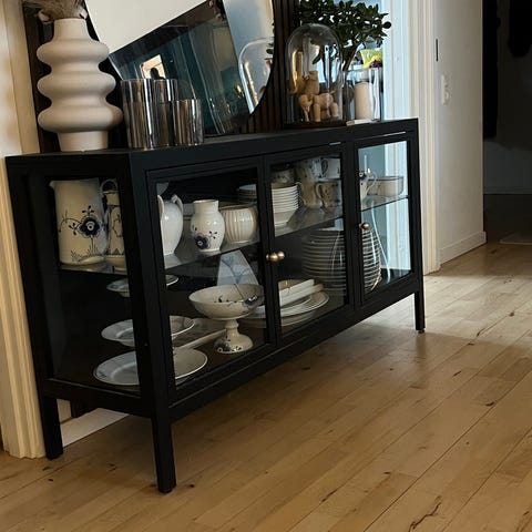 Sælger mit flotte vitrineskab pga flytning , skabet står som nyt, er ca 3 år gammelt, nypris 3.000kr. Skabet har faste hylder og bagbeklædning af sort metal, meget robust og gedigent, kan ikke skilles ad. Mulighed for at fastgøre skabet til væggen.