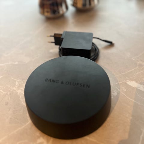Bang & Olufsen BeoSound Core audio converter boks. Enheden fungerer som lydhub til tilslutning af forskellige lydkilder og højttalere. Model: BeoSound Core, type nr. 2797. Input: 5V – 2,0A. Leveres med strømforsyning som vist på billedet. Egnet til integration i Bang & Olufsen lydsystemer, hvor der er behov for digital til analog konvertering og netværksforbindelse afhængigt af opsætning.
