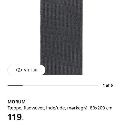 IKEA MORUM tæppe, fladvævet model i beige. Tæppet måler 200x300 cm og har en struktureret overflade med vævet mønster. Det er egnet til brug både inde og ude på fx terrasse, altan eller i opholdsrum. Fladvævet konstruktion gør det relativt let at støvsuge og holde rent. Tæppet er købt for 2 måneder siden og har ligget rullet sammen det meste af tiden, sælges da det desværre ikke passer i størrelsen til vores stue alligevel. Så derfor ingen brugsspor og i så god som ny stand