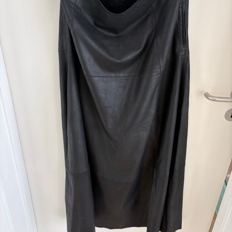 Skindkjole, Depeche , str. L, Camel , Skind , Ubrugt, Long shirt dress. Kan bruges til jakke og kjole. Kan dresses op og ned alt efter tilbehør. Den er helt ubrugt prismærke sidder stadig på. Prisen er på depeches hjemmeside 1999 kr. der står størrelse 40 i den. Brystvidde er 120 cm.