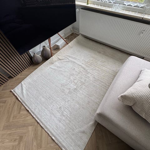 Beige gulvtæppe fra Ellos sælges grundet flytning, er under 1 år gammelt, ingen pletter eller fejl på gulvtæppet.