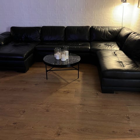 Hjørnesofa med chaiselong i sort læder. Sofaen har indbygget reclinerfunktion i et af sæderne, som kan slåes ud til afslapning. I armlænet er der opbevaringsrum med hængslet låg. Sofaen står på ben i metal og har høje ryglæn med polstrede nakkestøtter. Velegnet som rummelig sofa til stue eller tv-rum, hvor der er behov for ekstra sidde- og liggeplads samt opbevaring.