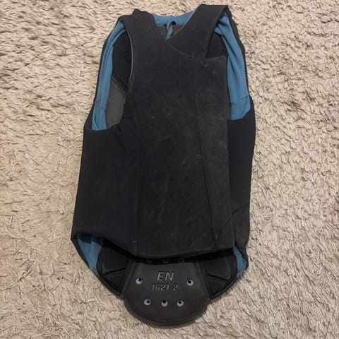 Komperdell Cross Protection rygskjold vest i sort og blå. Vest med integreret rygbeskytter, der dækker rygsøjlen med et fleksibelt beskyttelseselement.