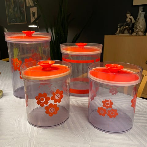 Fin og dekorativ 'stabel' kagedåser i metal og farvelagt i sarte pastelfarver. Dåserne er svenske (Triett", J-H FABRIKEN SÄVSJÖ) og fra ca. 1950'erne. Diameter ca. 19 cm, højde uden låg 19,5 cm. Kan sendes på købers regning.