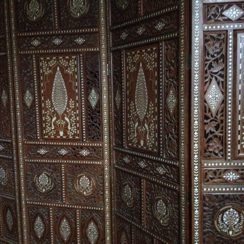 Japansk rumdeler skærmvæg med traner motiv. Skærmvæggen består af flere sammenhængende paneler med gylden baggrund og dekoration af traner og skyer på forsiden. Bagsiden er sort med enkle blomsterillustrationer i cirkler. Velegnet som rumdeler eller dekorativ væg i stue, soveværelse eller kontor. På enkelte felter ses synlige afskalninger i overfladen ved hængslerne, som kan kræve reparation eller efterbehandling.