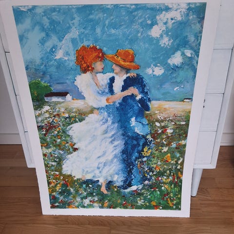 Farverne er helt fantastiske – skønne blå og orange nuancer, der giver værket et varmt og levende udtryk. Motivet er særligt powerfuldt: et dansende par midt i naturen, fuld af bevægelse og energi.