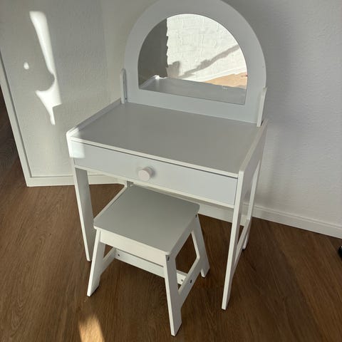 Sminkebord med spejl i flot industrielt design. Ca. 6 måneder gammelt og fremstår som nyt uden skader eller brugsspor. Stabil konstruktion med metalstel og skuffe til opbevaring. Perfekt til makeup, hårstyling eller som konsolbord på værelset eller i entréen.